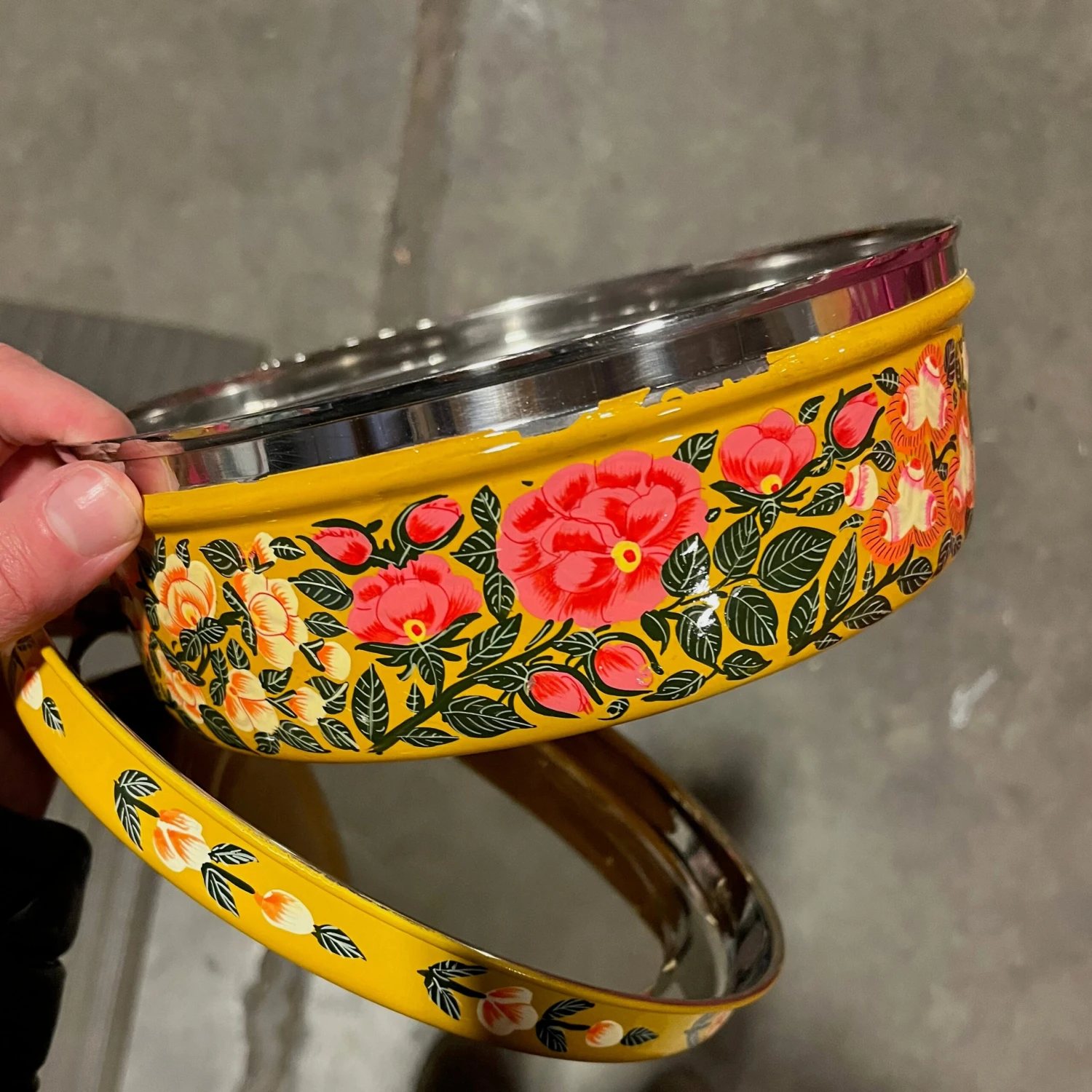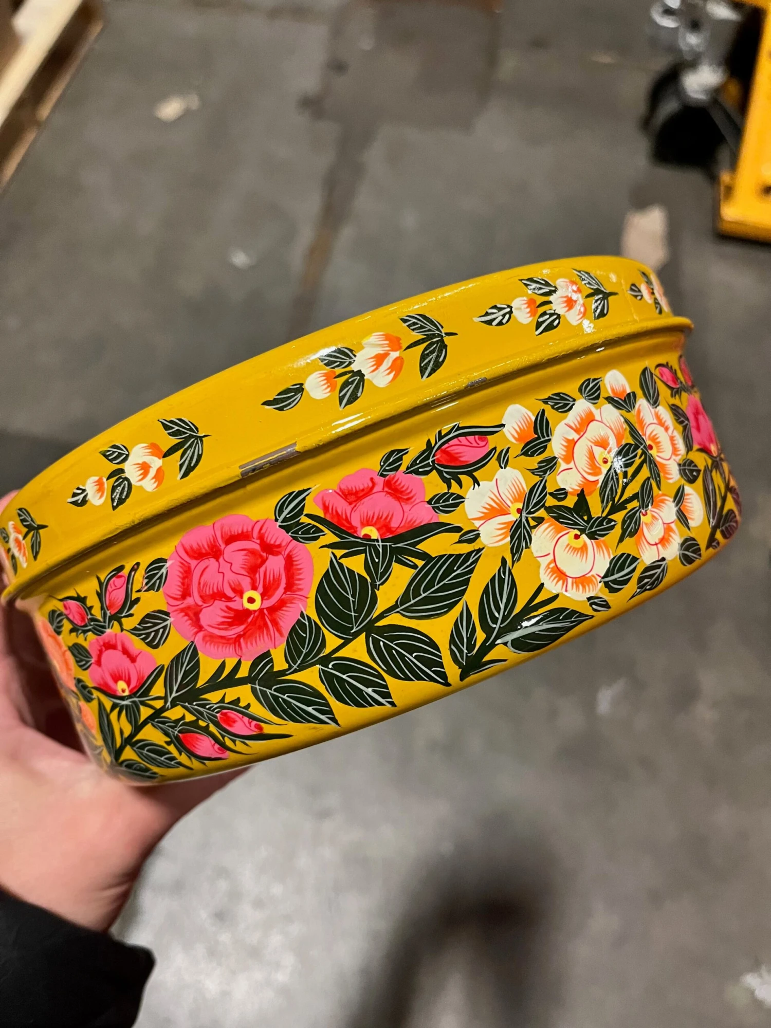 Taking inspiration from the biscuit and cookie tins of our childhoods, we worked with five renowned Kashmiri enamelware artisans from Kashmir-based Pyaala. The tins, inspired by Kashmiri papier-mâché handicraft technique, take nine months to hand paint because there are so few artisans with their level of technical artistry. Since each tin is hand painted, they all have their own character and no tin is exactly alike!