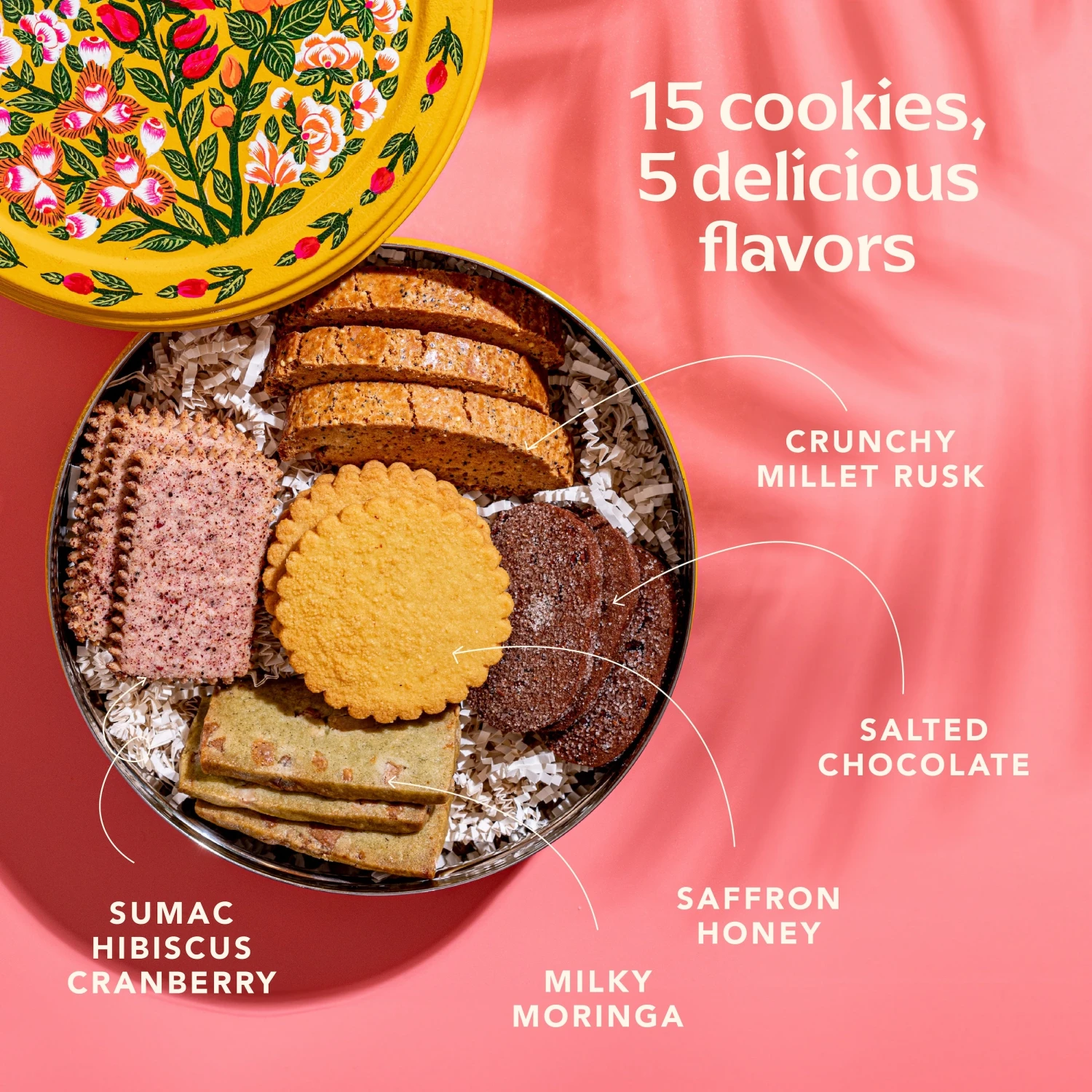 For a team whose members have grown up eating chai and biscuits as much as we did milk and cookies, we wanted to share the same joy with our community. Taking inspiration from the biscuits and cookie tins of our childhoods, we worked with the brilliant Laurie Ellen Pellicano — a New York-based baker, food stylist, consultant, and writer — to create five signature cookies with our spices. Your cookies also come in a custom tin created in collaboration with traditional and renowned Kashmiri enamelware artisans working with Kashmir-based brand Pyaala. Each tin is hand painted which means that they take many hours to create and that no tin is exactly alike.Â
