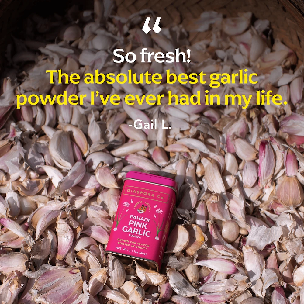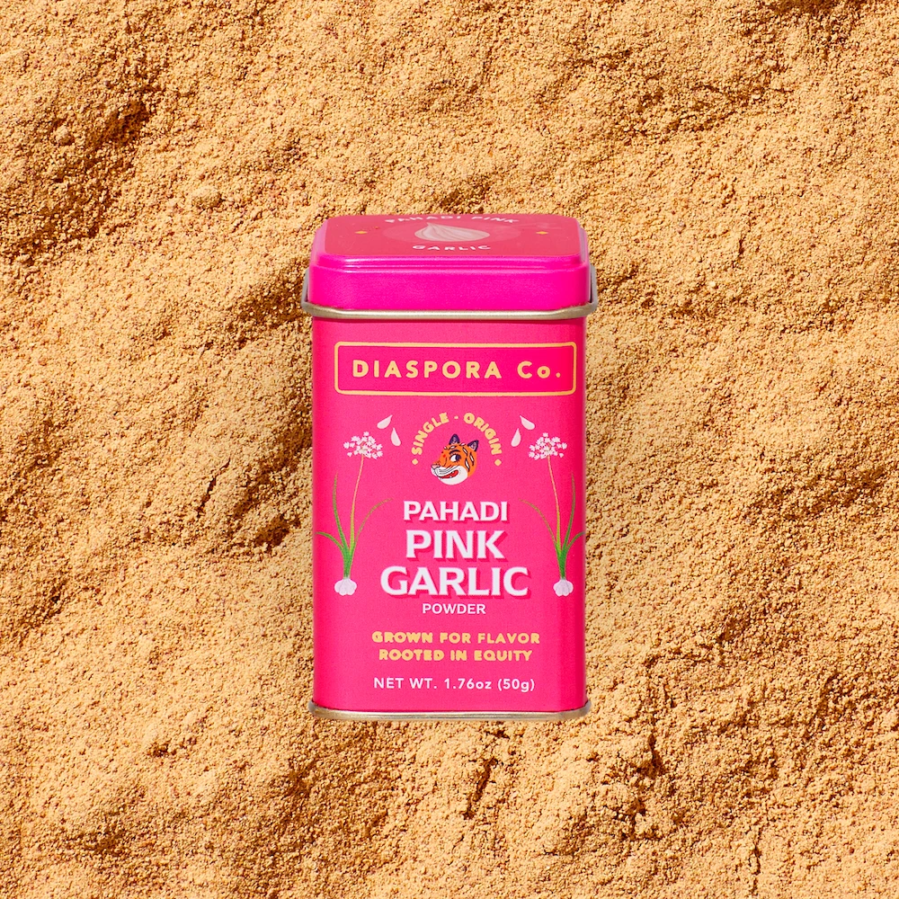 Pink Pahadi Garlic is sourced for us by Tons Trails — a community enterprise dedicated to bringing high-value economic engagement to 37 Himalayan villages. It is grown alongside rajma beans, apples, and lots of happy grazing goats!